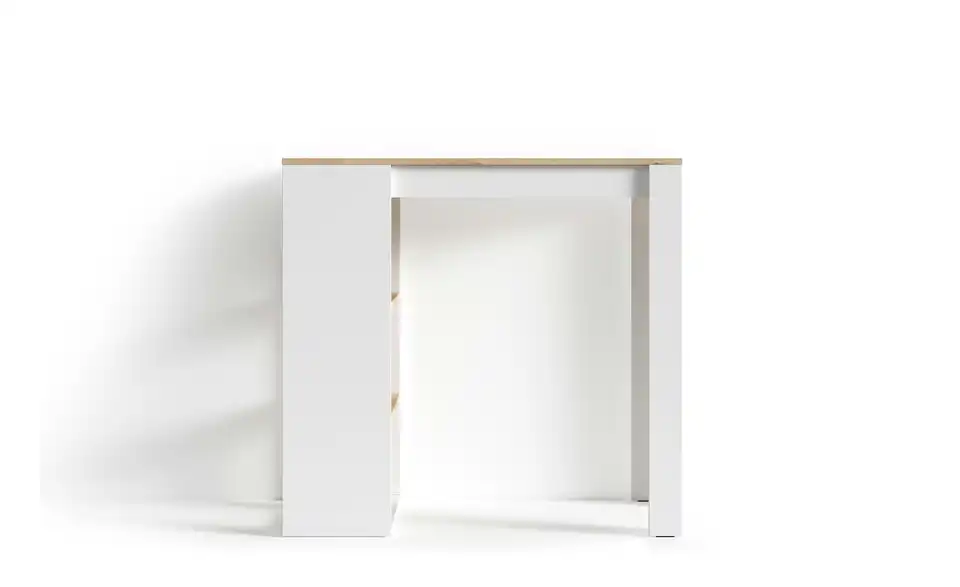Dieser Bartisch wirkt durch die Kombination aus zeitlosem Weiß und attraktiver Nachbildung in Artisan Eiche hell und freundlich. Seitlich besitzt er sechs Regalfächer: Drei schmale und drei größere. Hier können Sie Barzubehör, Rezeptbücher und Mehr unterbringen.