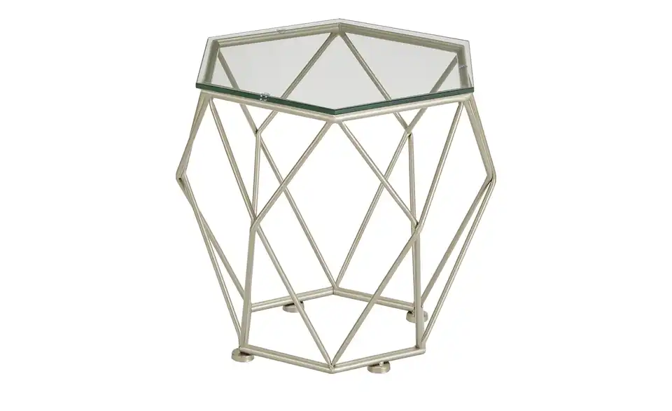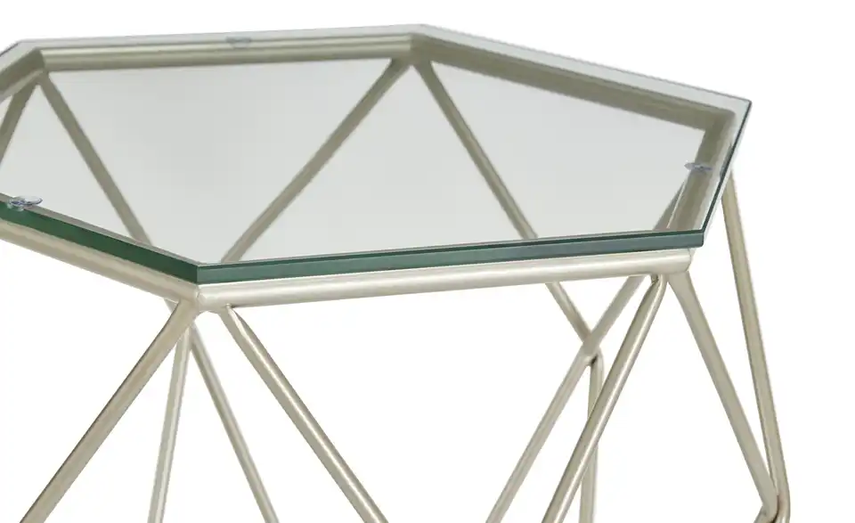 Der Beistelltisch Urban Scandi fällt durch sein geometrisches Design ins Auge. Das extravagante Gestell ist aus Metall und pulverbeschichtet. Der Champagnerton hat einen leichten Glanz und wirkt sehr edel. Die Tischplatte in Form einer Wabe ist aus stabilem Glas.