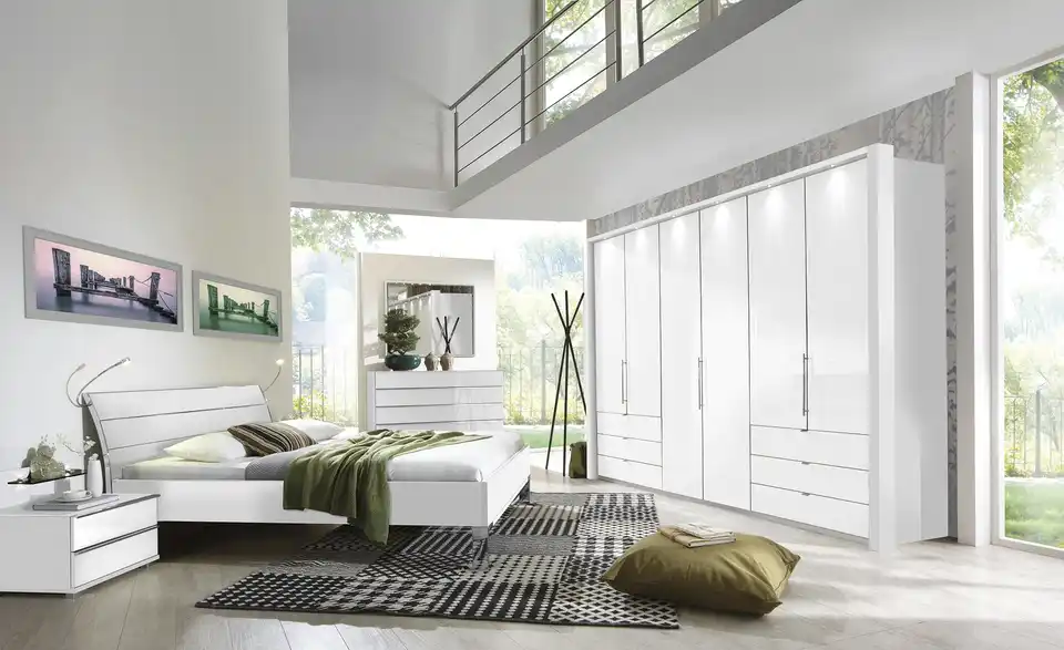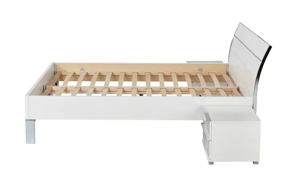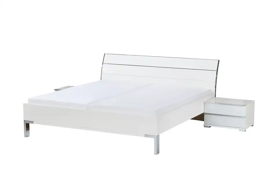Mit ihrem alpinweißen, modernen Look schafft die Bettanlage Beda eine schöne Basis für eine traumhafte Schlaf-Atmosphäre. Das Kopfteil ist dezent geschwungen und wird mit verchromten Leisten abgesetzt. Der Chromlook wird von den Füßen in Winkelform und an den Nachtkommoden gekonnt aufgegriffen. Gleicht zwei Nachtkonsolen sind im Lieferumfang enthalten. Sie verfügen über jeweils zwei Schubladen als praktischer Stauraum. Ihre Front ist aus edlem Glas gefertigt. Sie können Beda mit Lattenrosten und Matratzen nach Wunsch ergänzen. Sie sind separat erhältlich.