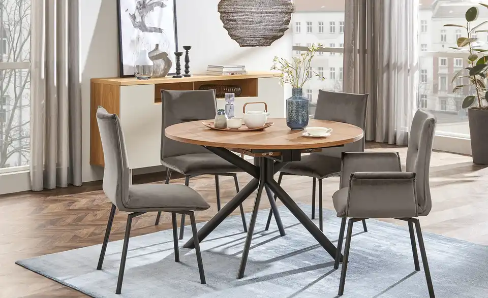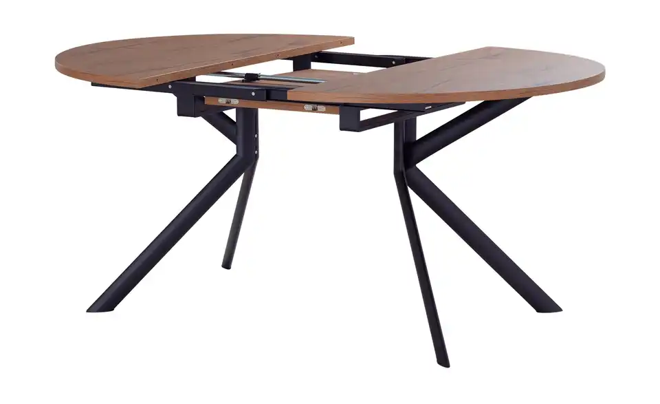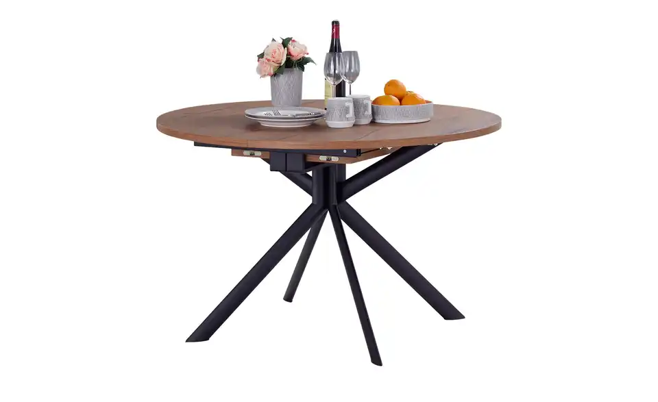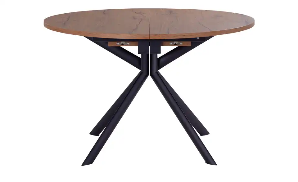 Italienisches Design trifft Funktionalität: Der Esstisch Giove. Ein Blickfang sind die abgespreizten Tischbeine in mattem Schwarz, die eine Sternform bilden. Das schwarze Metallgestell setzt einen bewussten Kontrast zur runden Tischplatte in dunkler Tabakeiche-Optik. Die Tischplatte bietet mit einem Durchmesser von 120 Zentimetern ausreichend Platz für vier Personen. Durch die integrierte Klappeinlage lässt sich der Esstisch Giove mit wenigen Handgriffen um 45 Zentimeter erweitern. In dieser verlängerten Form zeigt Giove nicht nur sein zweites Erscheinungsbild, sondern schafft auch Platz für zwei weitere Tischgäste.