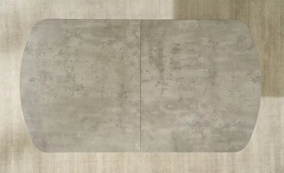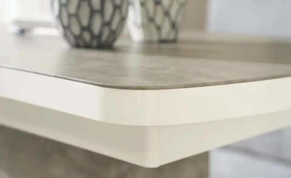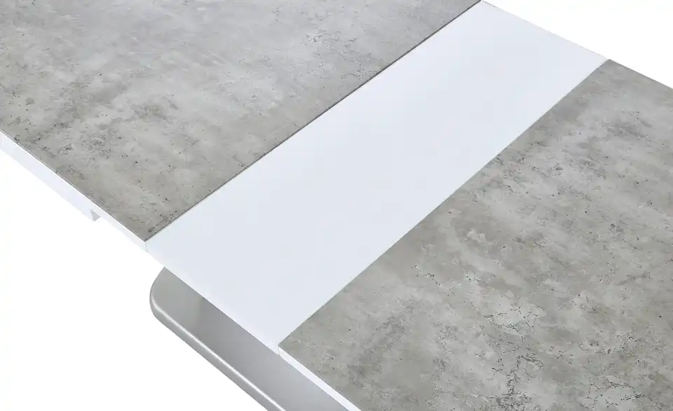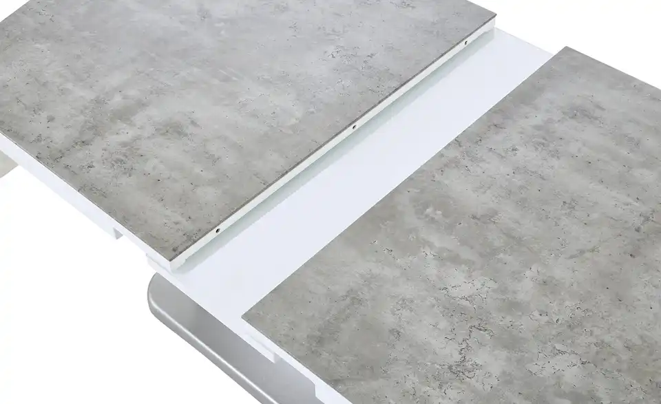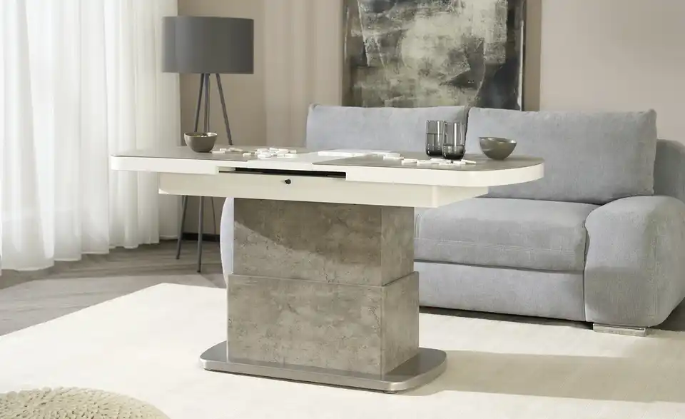 Die Beton-Optik macht den Tisch Sizilien zu einem echten Hingucker. Die Glasoberfläche veredelt die graue Tischplatte. Die Bodenplatte aus Metall und der weiße Tischrand setzen kontrastreiche Akzente. Der Tisch ist durch einen Hebel im Säulenfuß problemlos höhenverstellbar und kann sowohl als Couch- als auch als Esstisch genutzt werden. Mit dem integrierten Mittelauszug lässt sich die Tischplatte auf 160 Zentimeter erweitern. Dann können Sie bis zu acht Gäste empfangen. Der Couch- und Esstisch Sizilien findet in vielen modernen Wohnzimmern und Speisezimmern Platz.