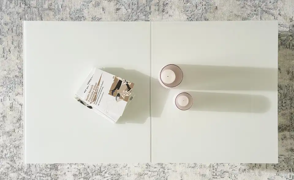 Grado ist Couch- und Esstisch in einem. Wie das geht? Sie können den Tisch ganz nach Bedarf in der Höhe und Länge variieren. Die Höhe des Tisches ist zwischen 47,5 bis 75 Zentimetern anpassbar. Dazu brauchen Sie einfach nur das Pedal betätigen und die Tischplatte auf die gewünschte Höhe hochziehen. Um die Tischplatte auszuziehen, wird der kleine Knopf an der Tischseite gedrückt und schon können Sie beide Tischseiten auseinanderziehen. Danach wird die mittige Einlegeplatte zwischen die beiden Tischenden geschoben. Das Gestell des Tisches ist weiß lackiert und hat ein edles Hochglanzfinish. Die Tischplatte besteht aus Weißglas und greift somit den Farbton des Gestelles wieder auf. Der Fußsockel und die Absetzungen am ausgezogenen Gestell sind aus Metall und matt gebürstet.