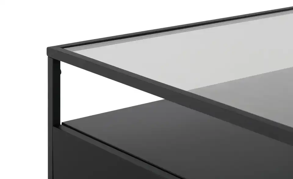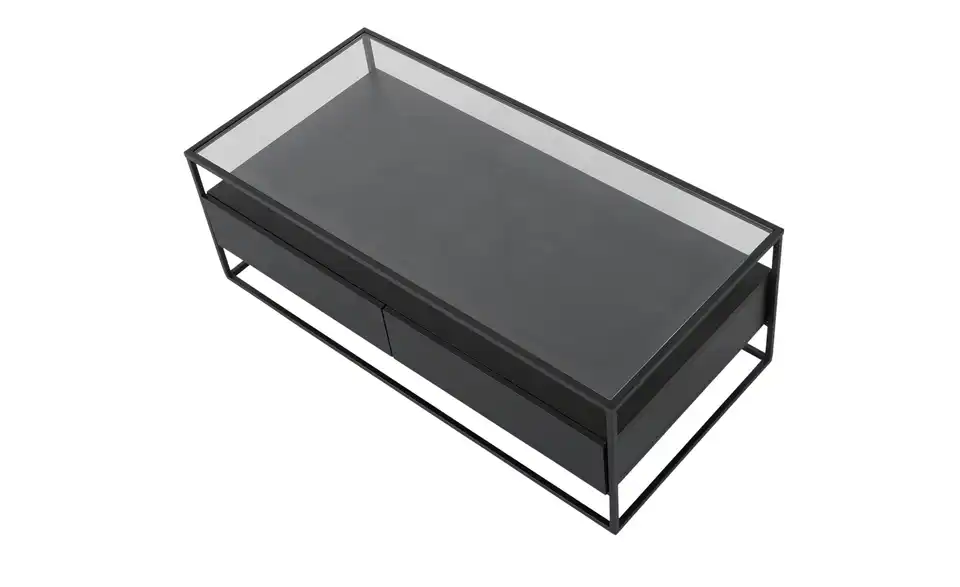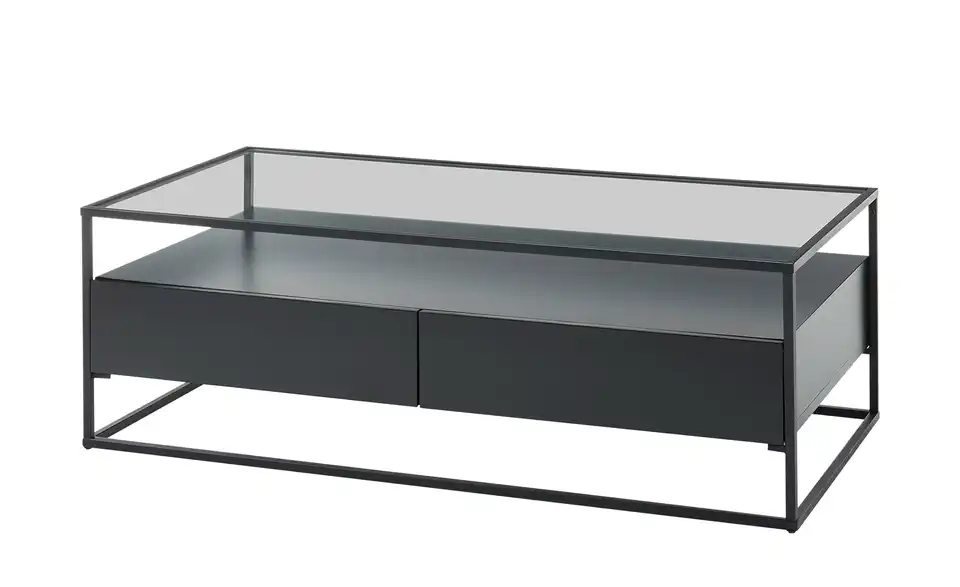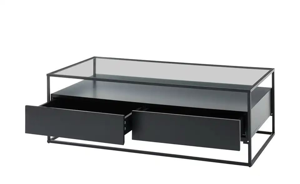 Klare Linien, kubistische Elemente und moderne Materialien wie Glas und Metall machen diesen Couchtisch zu einem stilvollen it-Piece in Ihrem Wohnzimmer. Unter der 120 x 60 Zentimeter großen Glastischplatte steht Ihnen einen ebenso große Ablagefläche zur Verfügung. Diese besitzt zwei geräumige Schubkästen, in denen Sie Fernbedienung und Co. blickdicht verstauen können. Das dunkle Metallgestell sorgt für stabilen Stand und gibt dem Couchtisch sein quaderförmiges, offenes Aussehen.