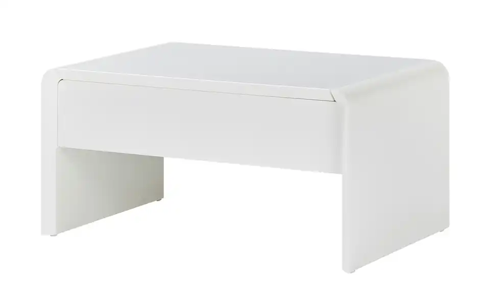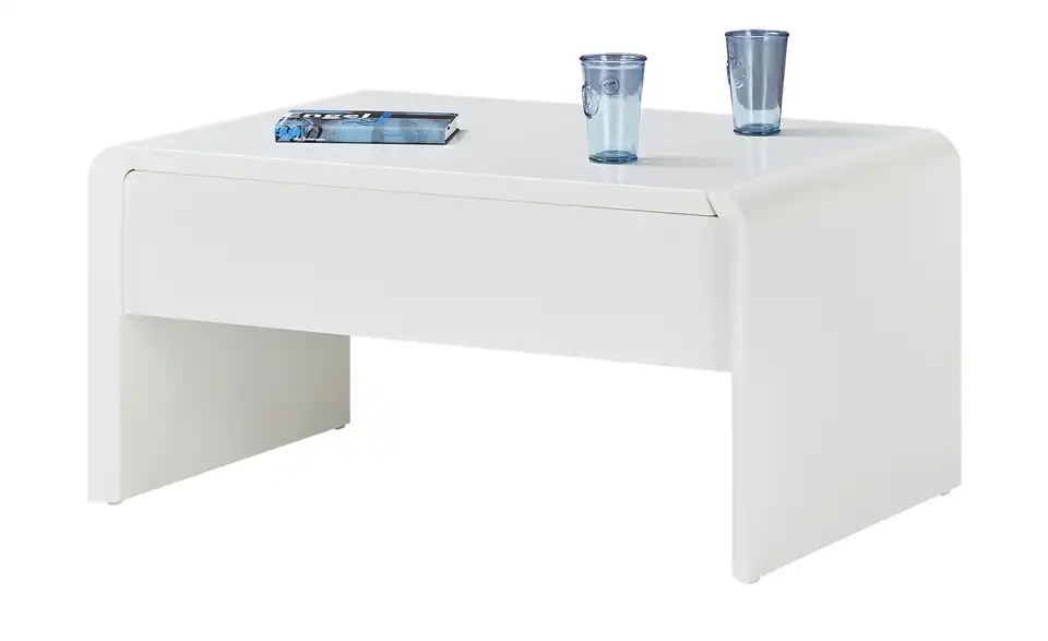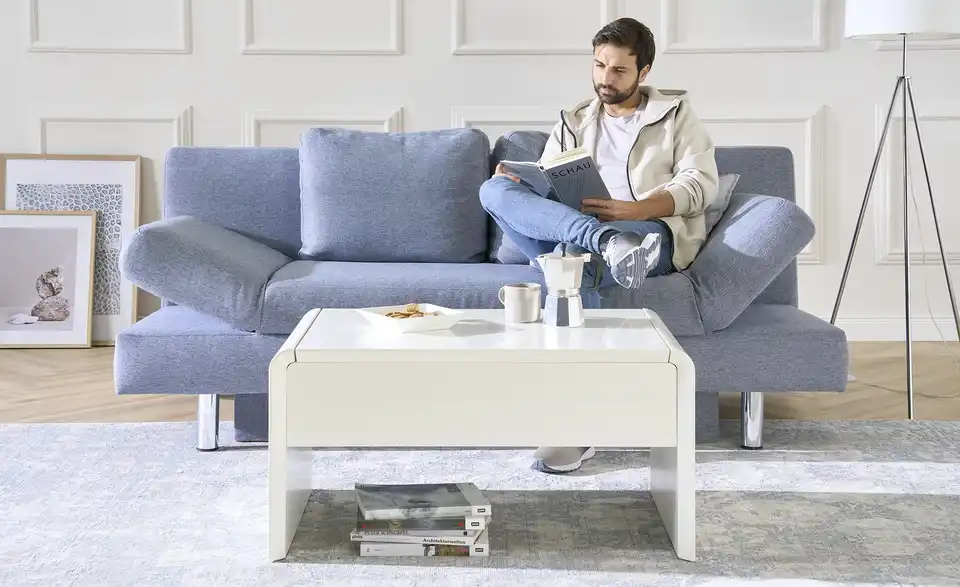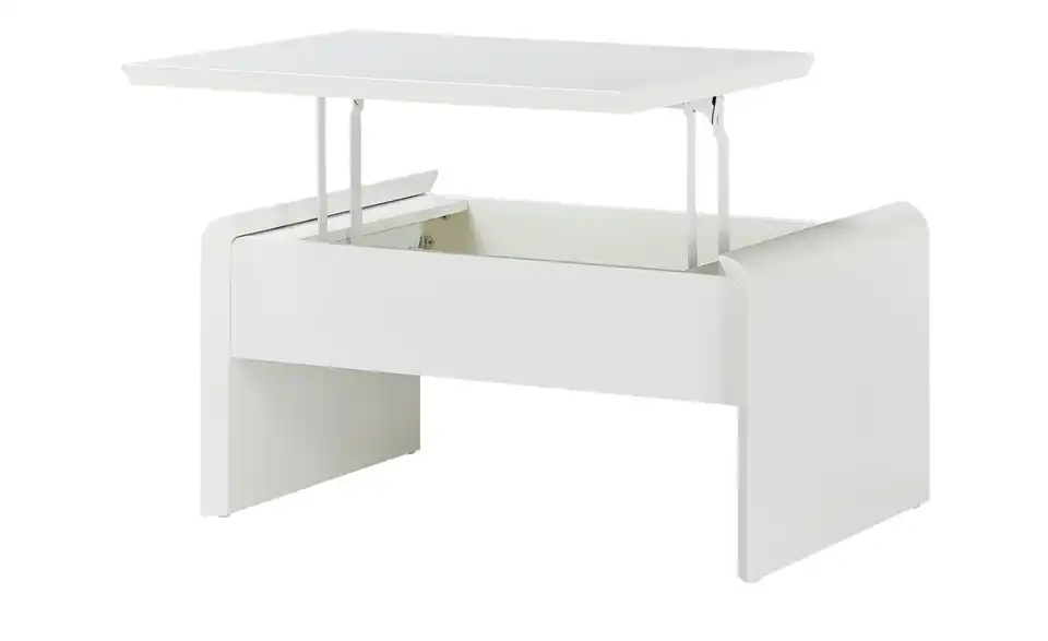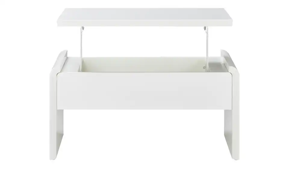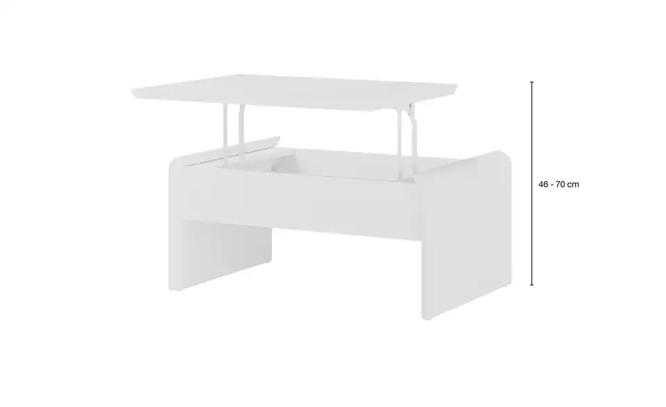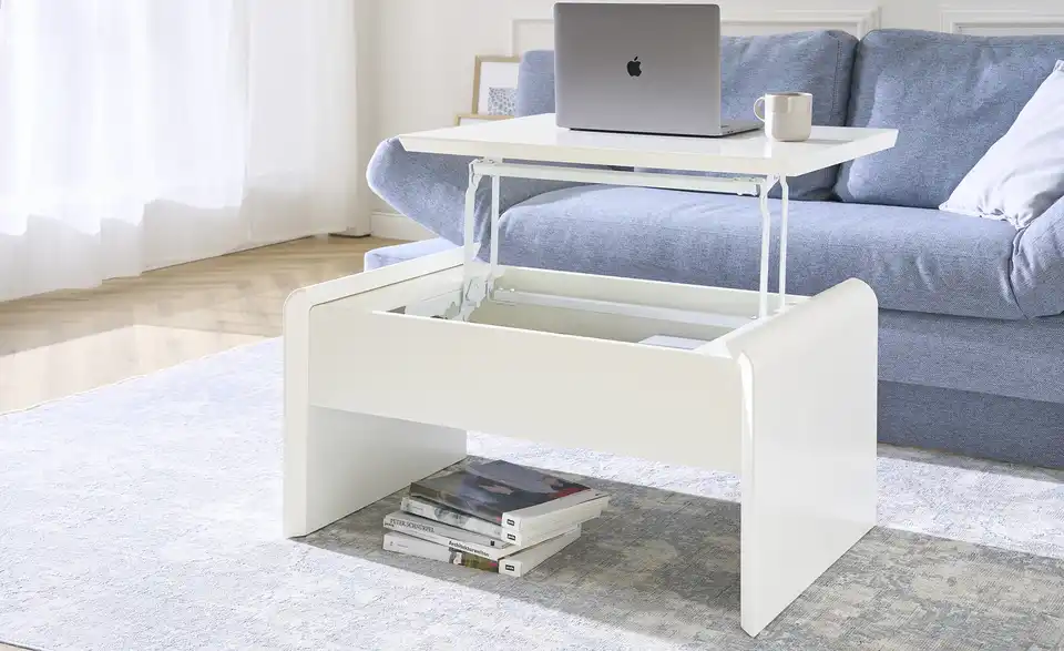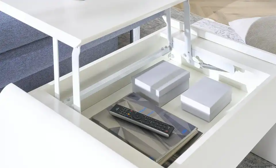 Ein kleines Multitalent ist der Couchtisch Ponza. In Sekunden können Sie die Tischhöhe ganz einfach von 46 Zentimetern auf 70 Zentimeter ändern. Dann hat die Tischplatte eine angenehme Höhe zum Arbeiten an Laptop, Tablet und Co. Mit der Liftfunktion ist das Verstellen der Tischplatten kinderleicht. Unter der höhenverstellbaren Tischplatte finden außerdem Magazine und Fernbedienungen Platz. Durch sein schlichtes Design und der zeitlosen Farbe Weiß fügt sich der Couchtisch Ponza in nahezu jeden Raum problemlos ein.