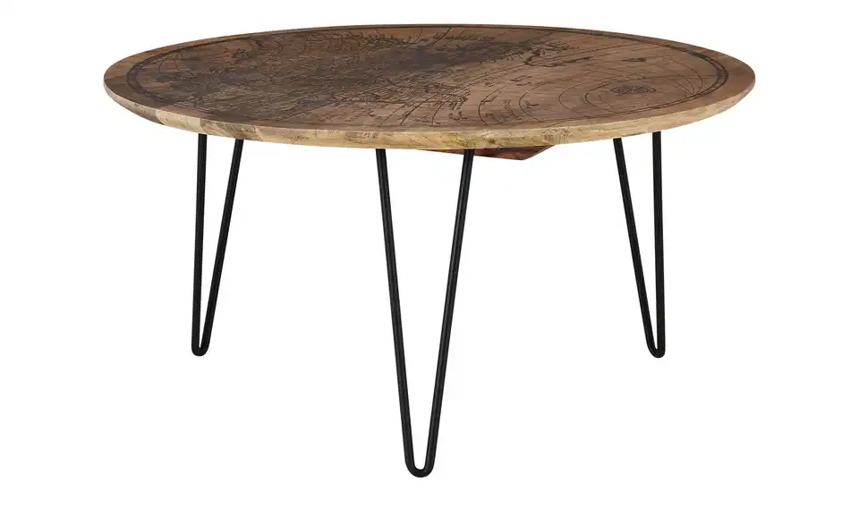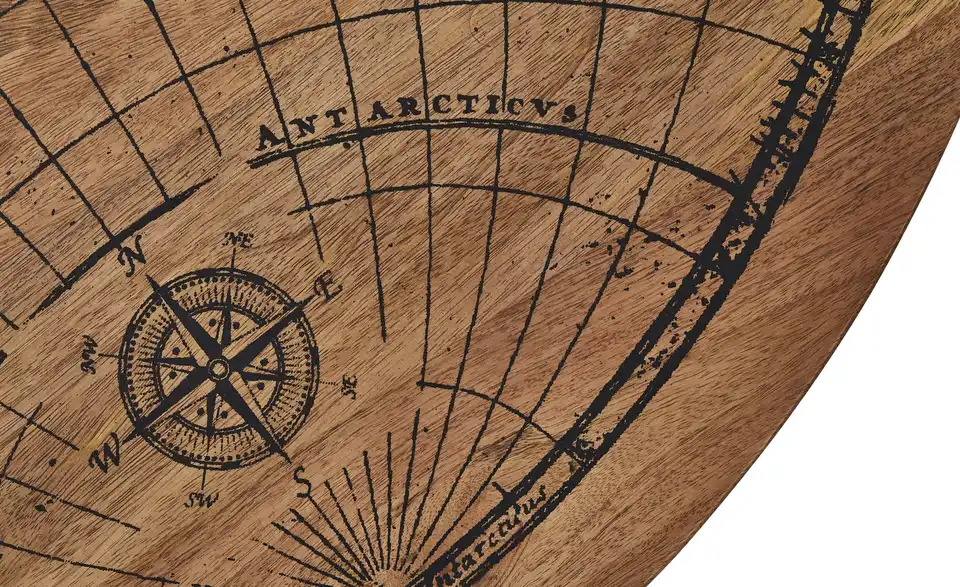 Die Tischplatte des Couchtisches Piazza fällt sofort ins Auge. Sie ist mit einer schwarzen Weltkarte im Vintage-Stil bedruckt. Neben den Kontinenten können Sie auch Längen- und Breitengrade sehen. Eine nautische Rose rundet das Design ab. Die Platte selbst besteht aus massiver Mango – und ist gebeizt und lackiert worden. Die drei Tischbeine sind aus schwarzem Metall gefertigt.