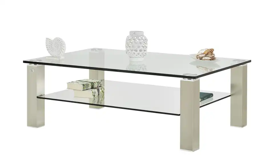 Der Couchtisch Rickert besticht durch kühle Eleganz. Er vereint Glas und Metall als hochwertige und stabile Materialien. Tischplatte und Ablage bestehen aus Klarglas. Es ist strapazierfähig und hat eine pflegeleichte Qualität. Alle vier Metalltischbeine sind vernickelt und haben ein mattes Finish, das zum eleganten Gesamtlook passt. Tischbeine und Glasplatte werden von titanfarbigen Applikationen verbunden. Rickert hat eine exzellente Qualität und ist mit dem Gütesiegel Made in Germany ausgezeichnet.