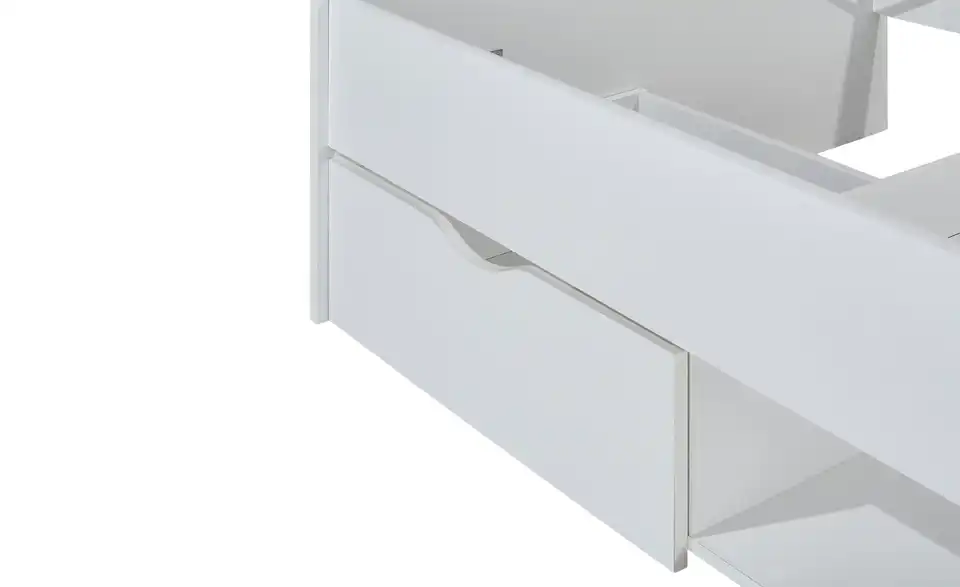 Das Bett mit Einzelliegefläche besitzt ein niedrig gehaltenes Kopfende sowie Fußende. Unter dem Bett können Schubladen links und rechts eingeschoben werden, in der Mitte des Einzelbettes befindet sich ein offenes Ablagefach.