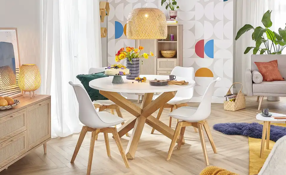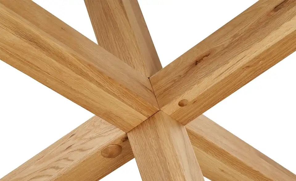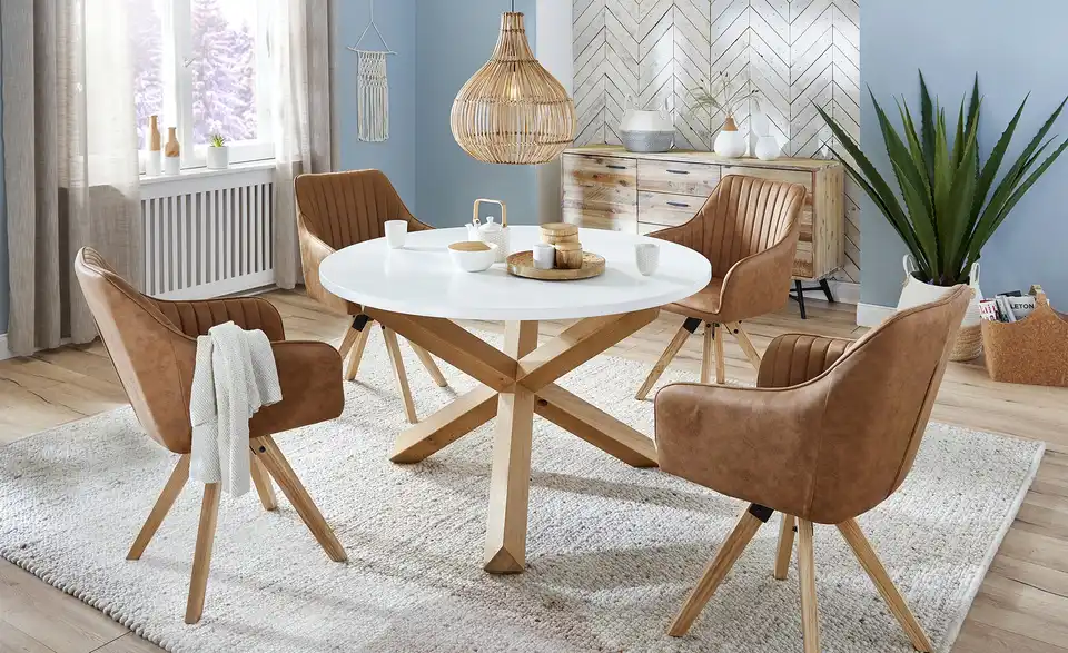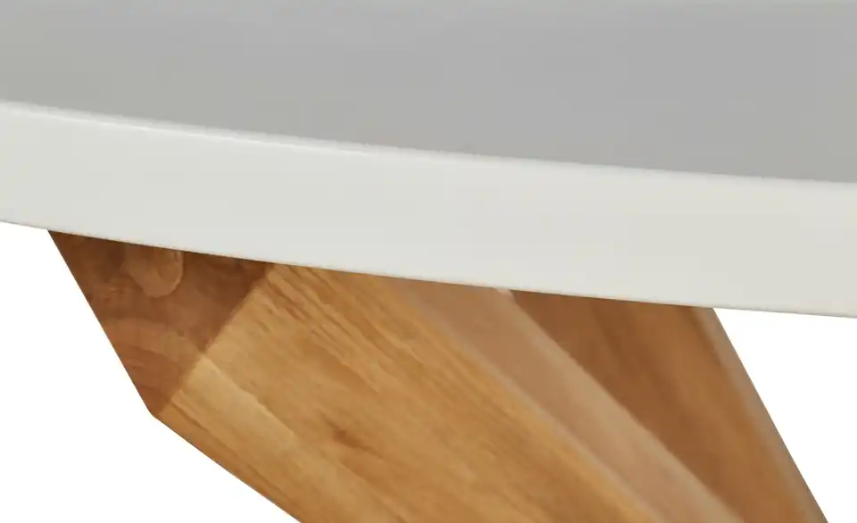 Der Esstisch Figo fällt durch sein interessant designtes Gestell auf. Es besteht aus drei Tischbeinen, die sich in der Mitte kreuzen. Alle drei Beine sind aus massiver Eiche gefertigt, ihre Oberfläche ist gewachst worden, um das Holz zu schützen. Auf dem Gestell liegt eine runde Tischplatte in mattem Weiß. Der edle Lack setzt sich schön vom natürlichen Holz der Tischbeine ab. Figo bietet Platz für fünf Gäste.