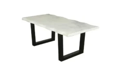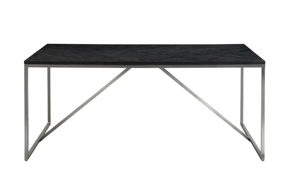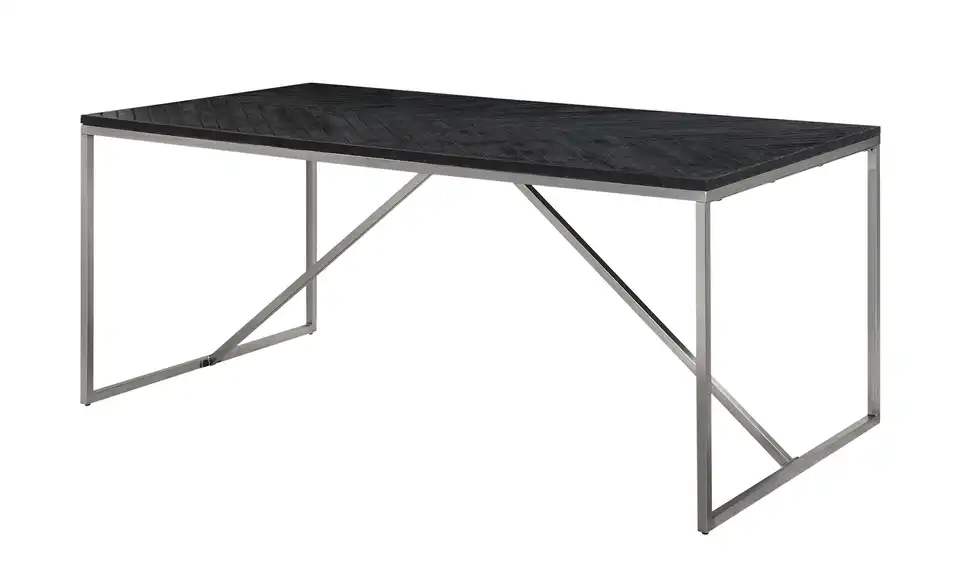 Der Esstisch Noire ist mit seiner schwarzen Tischplatte mit Fischgrätenmuster ein optisches Highlight. Am 95 x 180 Zentimeter großen Esstisch aus Mango-Massivholz finden bis zu sechs Personen Platz. Das helle Metallgestell in Kufenform bildet einen edlen Kontrast zur dunklen Tischplatte. Durch zwei zusätzliche Metallstreben bekommt der Esstisch Noire einen modernen Touch. Unser Tipp: Kombinieren Sie den Esstisch zu weiteren Möbeln der Serie Noire, um dem Stil treu zu bleiben.