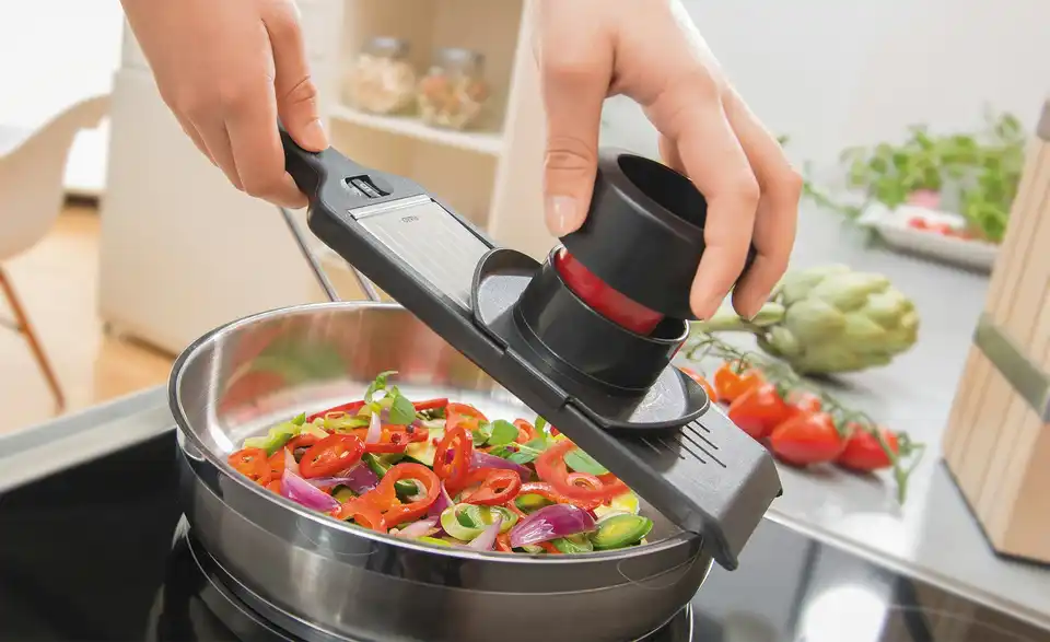 Der V-Hobel von Gefu hat auswechselbare Klingen, die sich sowohl zum Herstellen von Scheiben als auch Julienne eignen. Der japanische Klingenstahl garantiert lange perfekte Ergebnisse.