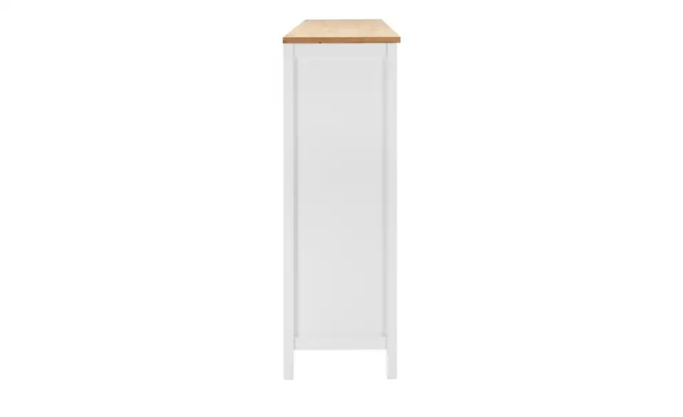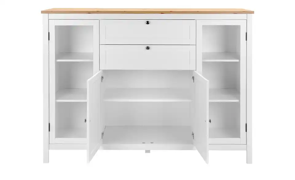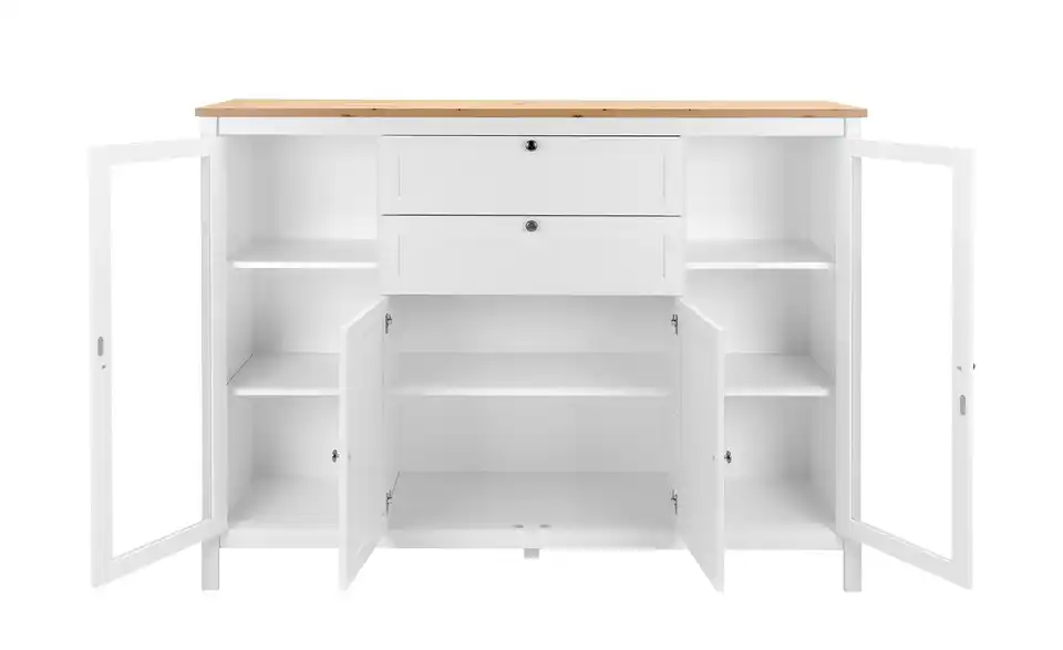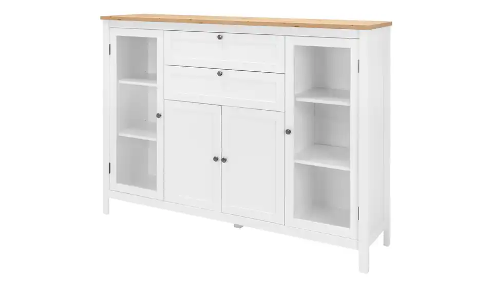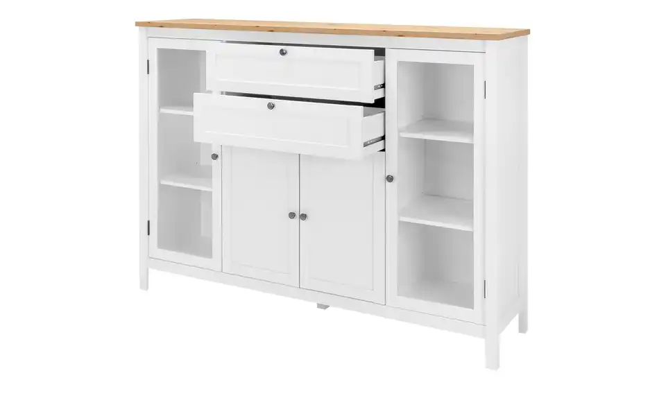 Die Serie Mazzano ist ideal für alle Liebhaber des Landhausstils. Der Kontrast aus zeitlosem Weiß und der attraktiven Asteichen-Nachbildung wirkt hell und freundlich. Dadurch passen die Möbel der Serie Mazzano in diverse Raumkonzepte. Dieses Highboard besitzt eine 160 x 40 Zentimeter große Ablageplatte, auf der Sie Dekoelemente, Pflanzen und Bücher platzieren können. Hinter den zwei Vitrinentüren stehen Ihnen je drei einsehbare Fächer zur Verfügung. Blickdichten Stauraum gibt es in den beiden Schubfächern und in den beiden Fächern hinter den unteren beiden Türen.