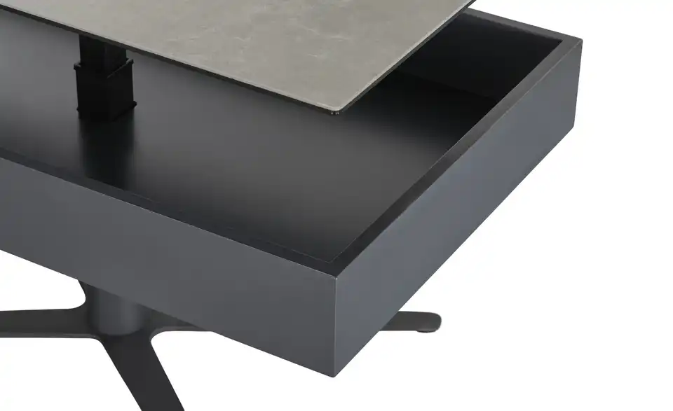 Dieser rechteckige Designer-Couchtisch der Marke Jette Home bringt praktische Eigenschaften für Ihren Alltag mit. Verstellen Sie die Höhe der Tischplatte bei Bedarf von 47,5 auf 66,8 Zentimeter. Verstauen Sie außerdem Zeitschriften, Fernbedienungen und Mehr im versteckten Fach unter der Tischplatte. So bleibt es immer aufgeräumt. Robuste Metallfüße und eine pflegeleichte Keramiktischplatte verbinden Stabilität mit kombinationsfreudigem Design.