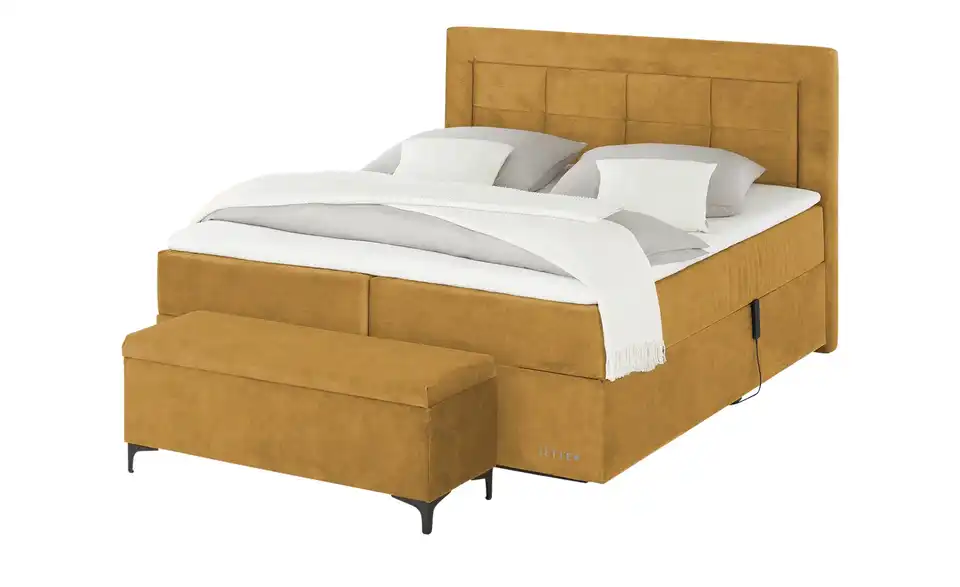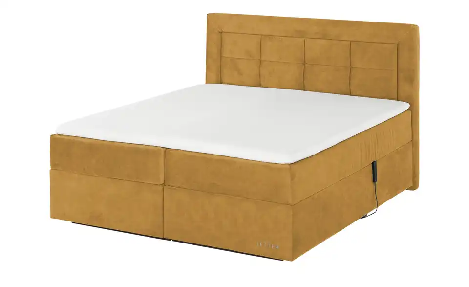Eine klare Linienführung und geometrische Akzente machen das Motor-Boxspringbett Jette Patch zu einem modernen Designermöbel. Das Kopfteil ist auch auf der Rückseite mit dem samtig weichen Bezug des Bettes bezogen. So können Sie das Boxspringbett bei Bedarf auch als Raumteiler platzieren und von der Wand abrücken. Doch auch Komfort wird beim Motor-Boxspringbett großgeschrieben: Dank der elektrischen Verstellfunktion können Sie auf Knopfdruck den Fuß- und Kopfbereich ganz einfach in die gewünschte Position verstellen. Machen Sie es sich bequem und passen Sie das Bett Ihren individuellen Komfortansprüchen an. Entscheiden Sie sich für den gewünschten Härtegrad der Matratzen und erleben Sie Ihr ganz individuelles Schlaferlebnis. Unser Tipp: Ergänzen Sie das Boxspringbett Jette Patch mit der gleichnamigen Bettbank der Serie. Diese bietet praktischen Stauraum für Bettwäsche und Co.