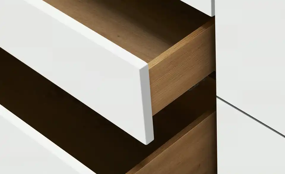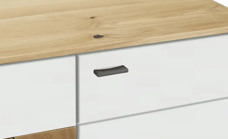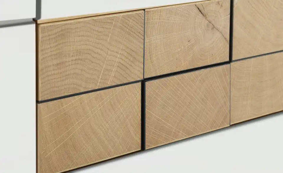 - Mehr zu MaterialFront aus Holzwerkstoff lackiert in Weiß matt / Akzente aus Hirnholz Bianco massiv geöltKorpus aus Holzwerkstoff furniert in Asteiche Bianco geölt