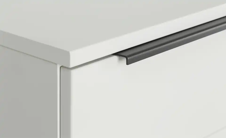 - Mehr zu MaterialKorpus und Front aus Holzwerkstoff lackiert in Weiß (Modern White)Schubladen-Absetzung in Stein-Optik