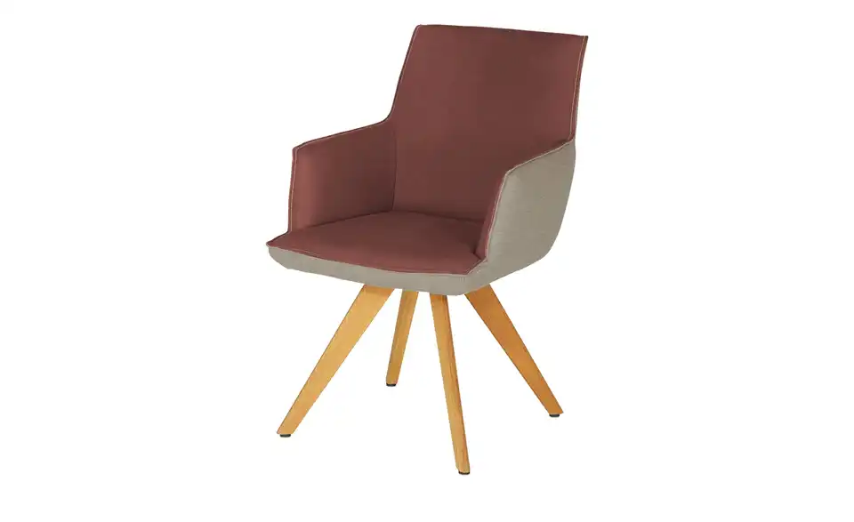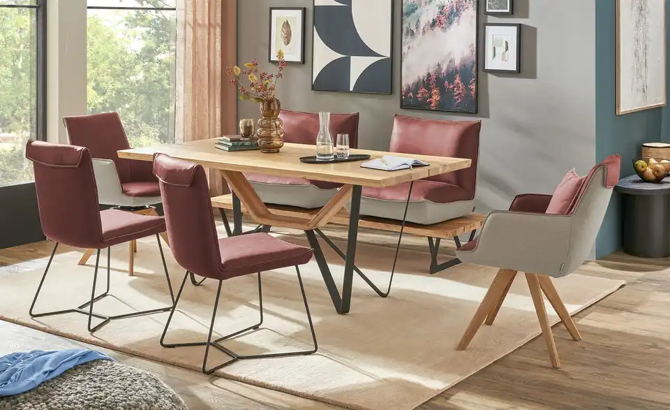 Für den Markenstuhl Schwof wurden hochwertigste Materialien verwendet und zu einem ganz besonderen Charaktermöbel designt. Hier gehen Wildeichenholz, echtes Büffelleder und Flachgewebe in Filzoptik eine attraktive Symbiose ein. Die beiden verschiedenen Bezugsmaterialien des Esszimmerstuhls unterscheiden sich haptisch und farblich voneinander und sind durch eine dekorative Kontrastnaht miteinander verbunden. An der Rückenseite des Stuhls setzt sich der Echtlederbezug ein Stück fort und betont so den Kontrast der beiden Bezugsmaterialien. Entscheiden Sie sich für Ihre Lieblingsbezugsfarbe und wählen Sie für noch mehr Komfort am Esstisch die Variante mit drehbarem Sitzbereich. Unser Tipp: Erschaffen Sie ein stilbewusstes Ensemble und kombinieren Sie mehrere Elemente der Serie Schwof miteinander. Unikate gefertigt in Bayern: Die Marke KOINOR steht für einzigartige Komfortfunktionen und individuelles Design. Unter Verwendung hochwertigster Materialien entstehen Möbel mit Vorzeigecharakter.