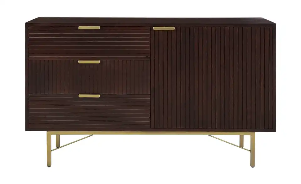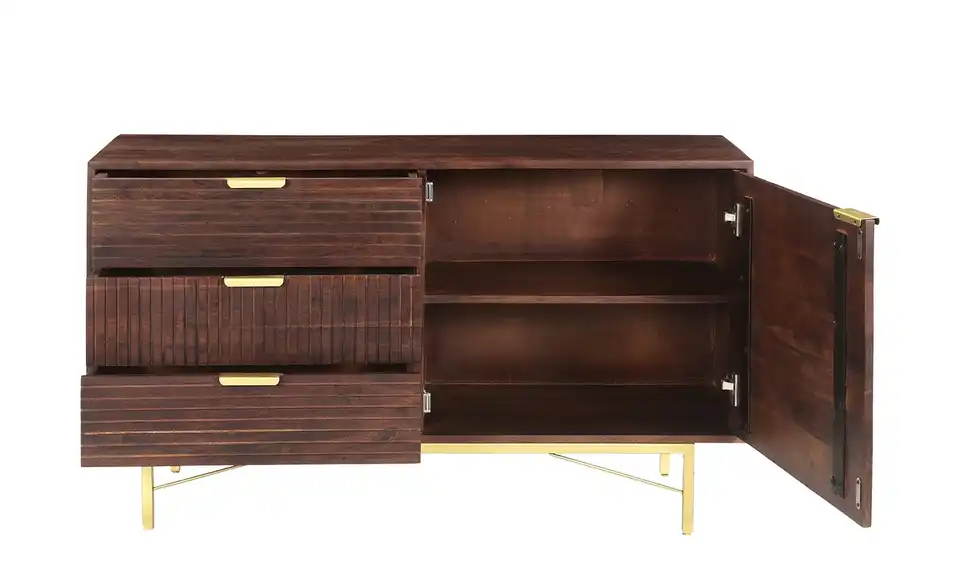 Dunkle Akazie und edle, goldfarbene Akzente: Das sind die Markenzeichen der Serie Dorado. Die Fronten der drei Schubfächer und der Tür sind mit einem attraktiven Relief verziert. Dahinter steht Ihnen praktischer Stauraum zur Verfügung. Getragen wird die Kommode von einem goldfarbenen Gestell, das wunderbar mit dem Akazienholz harmoniert. Unser Tipp: Bleiben Sie dem Stil treu und ergänzen Sie Ihr Wohnzimmer mit dem gleichnamigen TV-Lowboard oder dem Highboard der Serie.