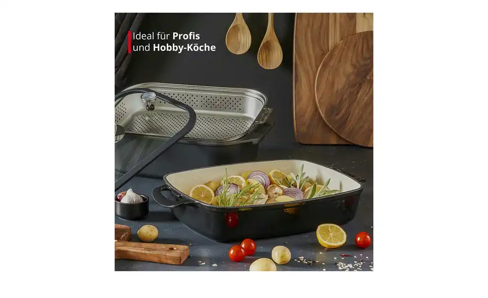 Saftiger Braten, knuspriger Auflauf oder aromatischer Eintopf – mit dem Bräter GUSTUS ist all dies möglich. Das abnehmbare Thermometer hilft bei der Einhaltung der korrekten Gartemperatur. Auch im Set enthalten ist ein Dämpfeinsatz, mit dem knackiges Gemüse gelingt, in dem alle Vitamine und Nährstoffe noch enthalten sind.