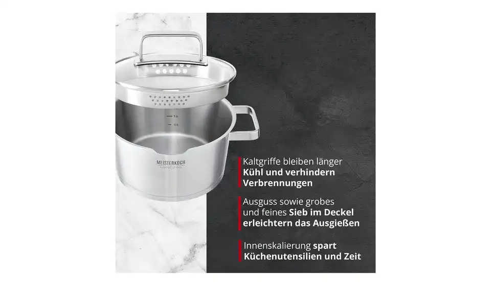Kochen Sie wie ein Profi – mit Meisterkoch und der Serie KONUS. Sie besteht aus Bratentöpfen in drei Größen – mit 16 cm, 20 cm und 24 cm Durchmesser – und einer passenden Kasserole. Alle vier Modelle sind mit einer praktischen Innenskala ausgestattet. Die serienmäßige Ausgusslippe und das integrierte grobe und feine Sieb im Rand des Glasdeckels erleichtern das Aus- oder Abgießen des Topfinhaltes. Sogenannte Kaltgriffe sorgen dafür, dass Sie die Töpfe auch ohne Topflappen anfassen können. Ihr konisches Design macht die Serie auch optisch zum Highlight in der Küche.