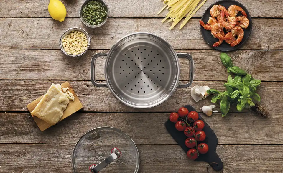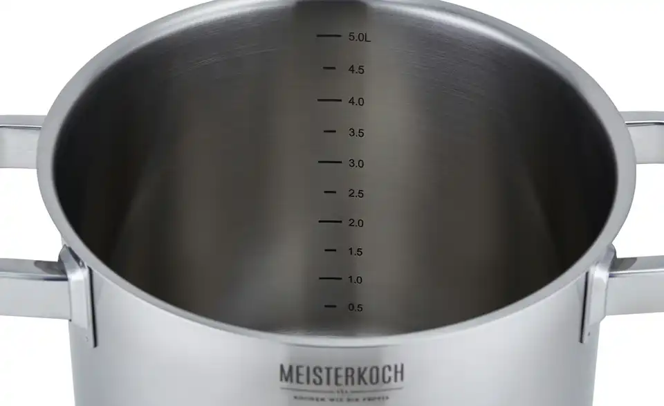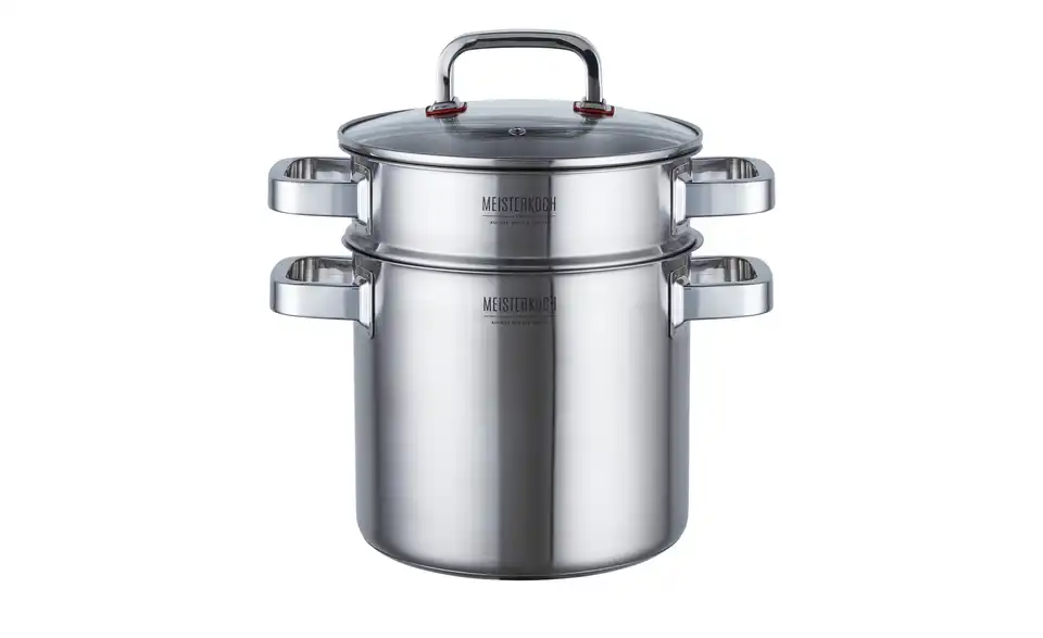 Der Spaghettitopf von MEISTERKOCH besteht aus zwei Topf-Einheiten und einem Glasdeckel. Die beiden Töpfe bestehen aus hochwertigem Edelstahl und sind dadurch langlebig und robust. Der untere Topf besitzt eine praktische Innenskalierung in 0,5er-Schritten. Der obere Topf fungiert als Nudelsieb und kann ganz einfach auf den unteren Topf aufgesteckt werden. Beide Töpfe erlauben durch ihren breiten Schüttrand ein tropffreies Ausgießen. Der mitgelieferte Glasdeckel passt sowohl auf den unteren, als auch auf den oberen Topf. Der Spaghettitopf ist spülmaschinenfest und dadurch einfach zu reinigen.