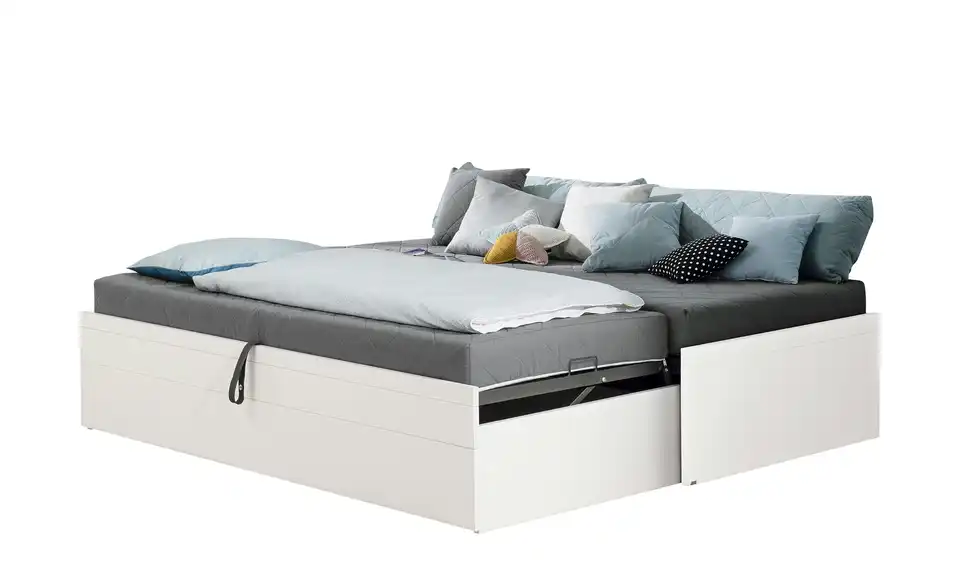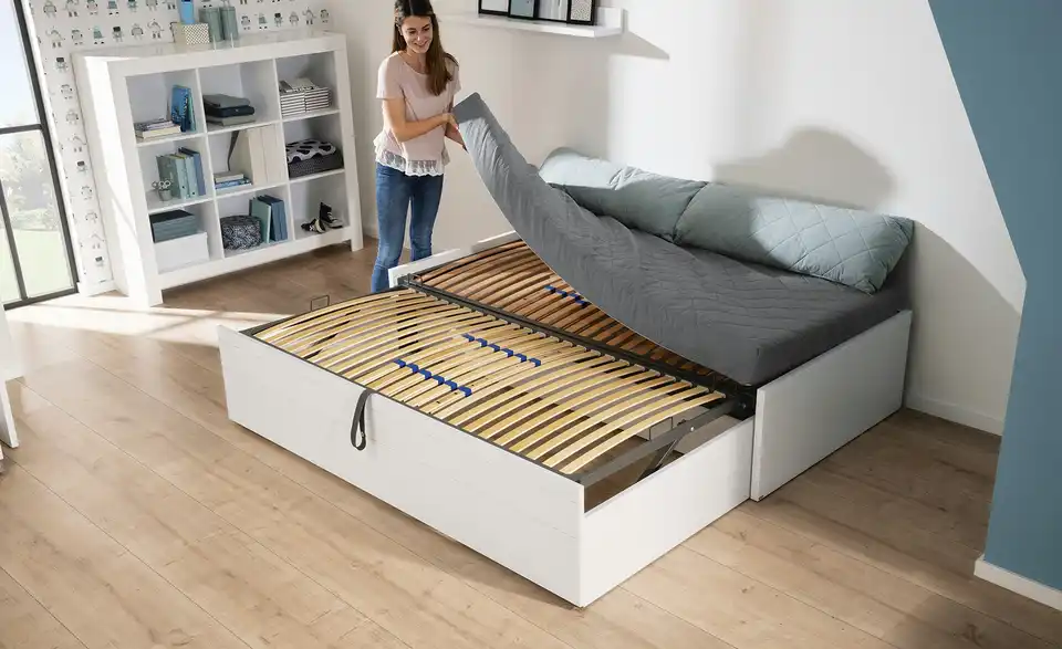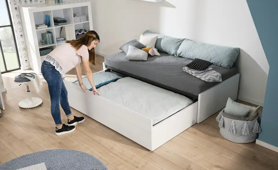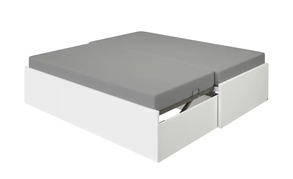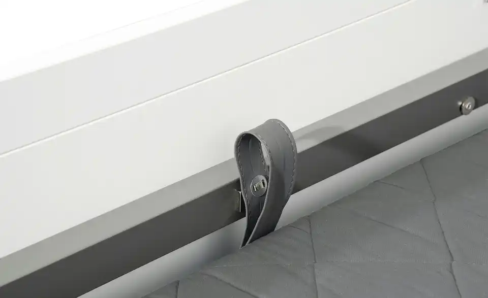 gehoben werden. Gurtband haftet beim Einschieben dank magnetischer Lasche auf der Innenseite des Rahmens. Ist die ausziehbare Liege eingeschoben, verhindert eine magnetische Sicherung das Herausrollen. Beide Liegen inkl. Federleistenrost mit 26 (Hauptliege) bzw. 24 (ausziehbare Liege) schichtverleimten Federleisten in Kunststofflagern und mittiger Härtegradverstellung im stabilen Metallrahmen. Gesamtliegefläche ca. 200 x 198,5 cm.