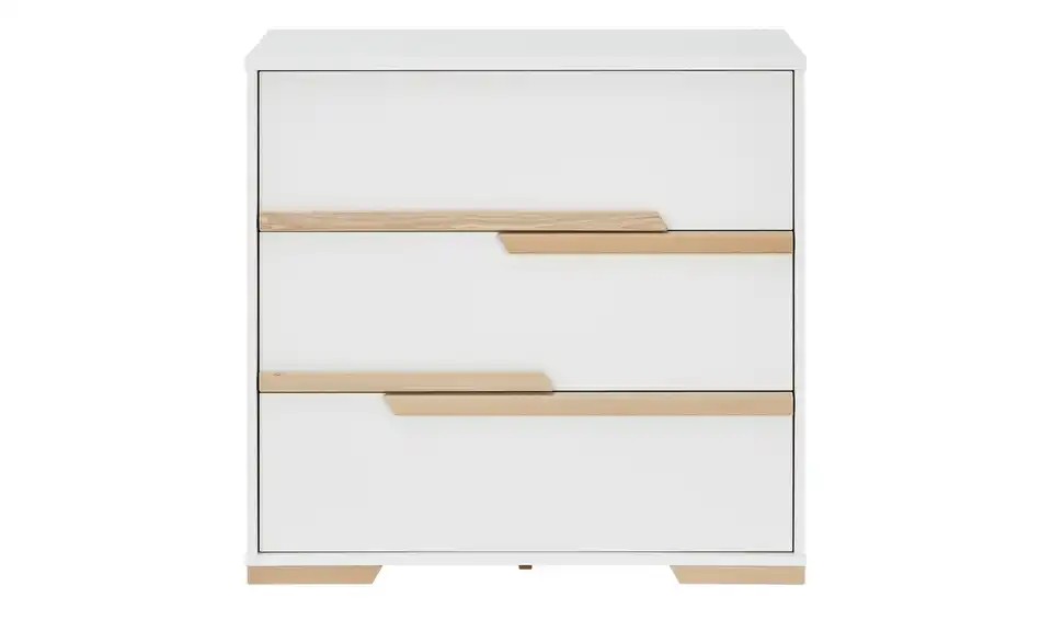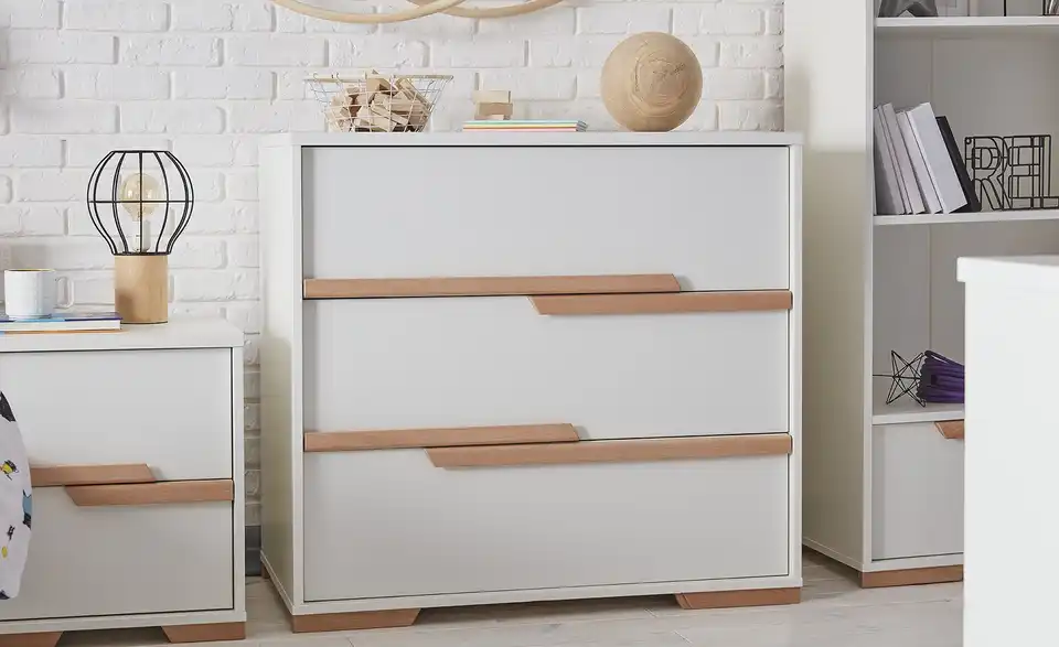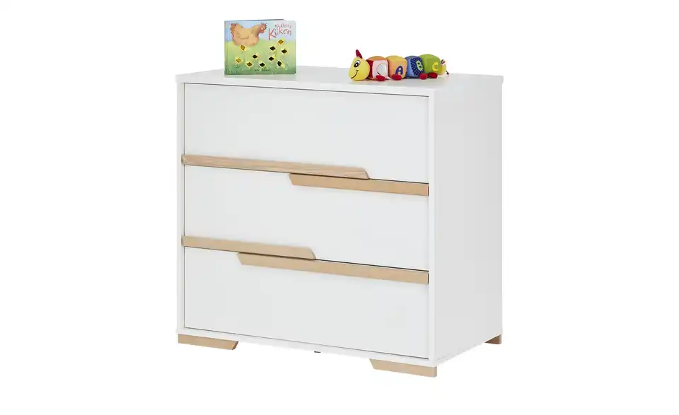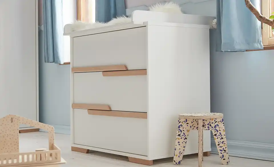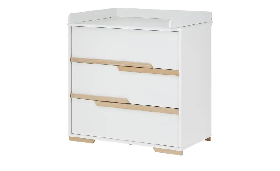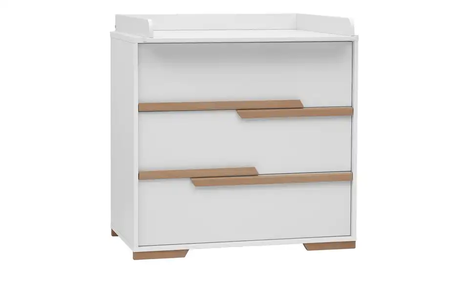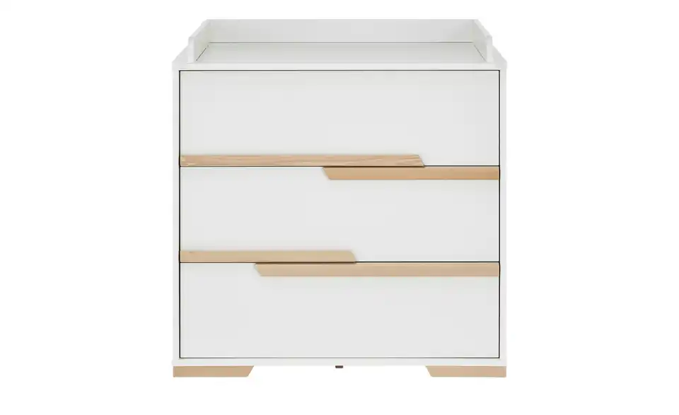 Mit ihrem Style bringt die Kommode Soe ein urbanes Design ins Baby- und Kinderzimmer. Vor allem die moderne Grifflösung fällt sofort ins Auge. Die Griffe sind – ebenso wie die Füße – aus massiver Buche. Sie setzen sich kontrastreich vom Weiß der Kommode ab. Der Korpus der Kommode ist hochwertig laminiert, die Front lackiert worden. Damit die Kanten vom Korpus besonders ebenmäßig sind, wurden Sie mit einem Laser geschnitten. Soe verfügt über drei geräumige Schubladen, die Sie vielseitig befüllen können. Dank der Soft-Close-Ausstattung schließen die Schubladen geräuscharm. Praktisch: Mithilfe des Wickelaufsatzes wird Soe zur Wickelkommode.