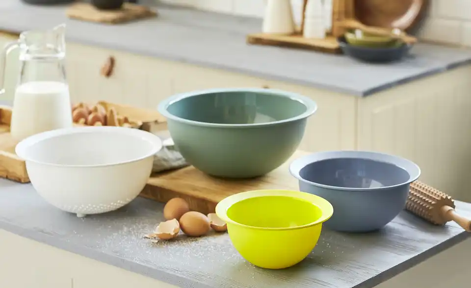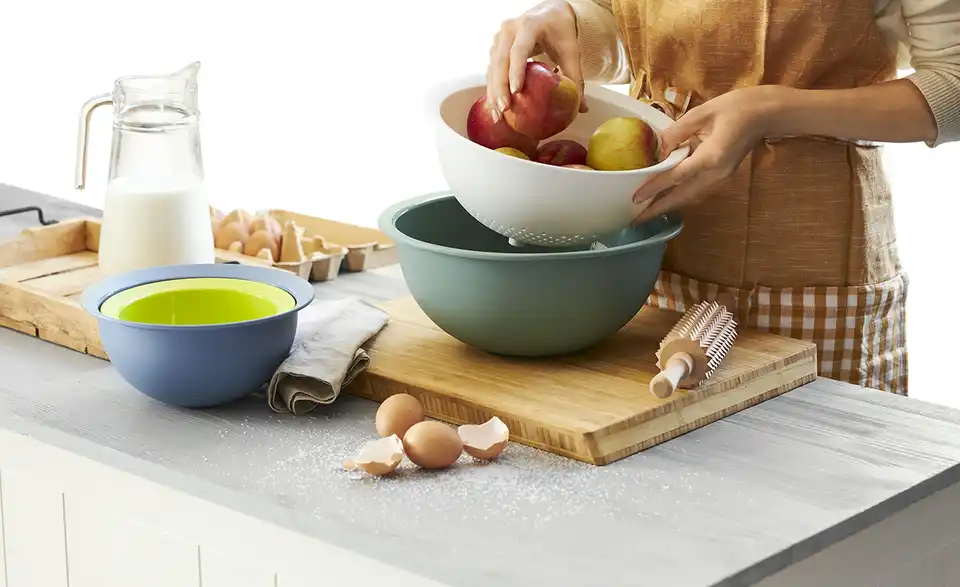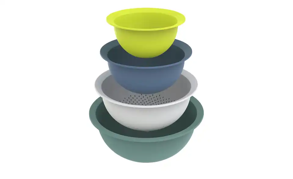 Alle Basics für den täglichen Bedarf vereint – das ist das platzsparende und formschöne Schüssel-Siebset. Die Schüsseln und das Sieb sind spülmaschinengeeignet und ineinander stapelbar.