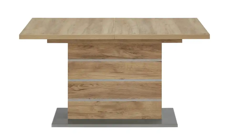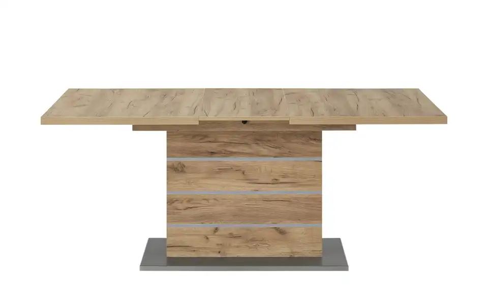 Wo gegessen wird, kann auch mal gekleckert werden. Der Esstisch Mira ist dafür bestens gewappnet. Tischplatte und Gestell sind beschichtet. Das macht sie besonders unempfindlich und auch pflegeleicht. Flecken können Sie so einfach wegwischen. Ebenso praktisch: Mira lässt sich ausziehen. Der Tisch ist nicht nur praktisch, sondern auch hübsch anzusehen. Das Dekor in Struktureiche Terra (Nachbildung) fällt durch seine rustikale Maserung auf. Am Säulengestell befinden sich interessante Metall-Applikationen. Auch die Bodenplatte setzt Akzente. Sie hat eine Edelstahloptik.