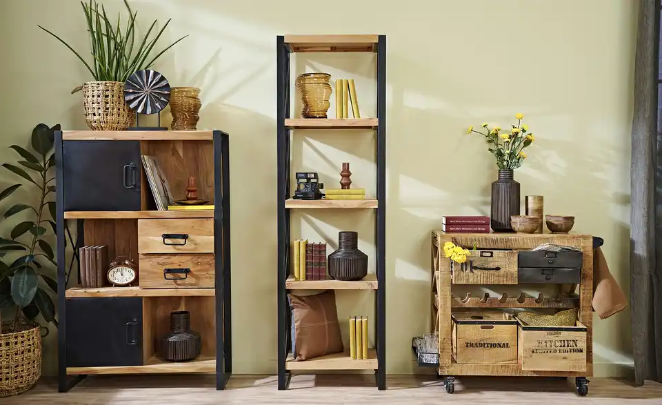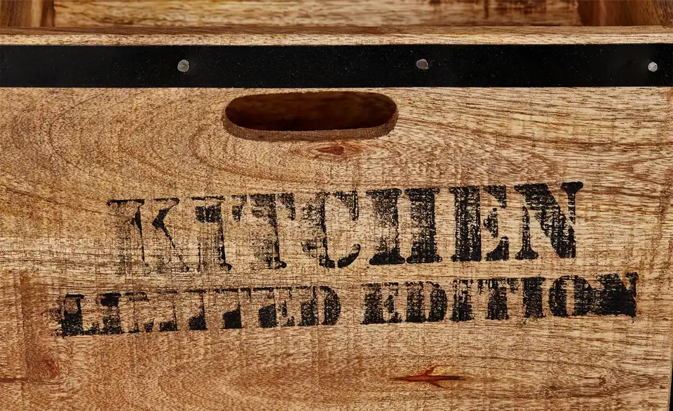 Das stylische Industrial-Design macht den Servierwagen Puno zum Highlight in Ihrer Küche oder beim BBQ auf der Terrasse. Puno besteht komplett aus Mango-Massivholz. Das Holz wurde gewachst, um den abgenutzten Shabby Chic zu erzielen. Zwei der Schübe wurden außerdem mit anthrazitfarbenem Metall beschlagen, das eine abgenutzte Optik hat. Weitere Details des Factory Styles sind die schwarzen Metallbeschläge, Beschriftungshalter und die aufgedruckten Zahlen und Schriftzüge im Used-Look. Unter der Arbeitsplatte befinden sich eine große und zwei kleinere Schubladen für Besteck und Küchenutensilien. Der praktische Flaschenhalter ist ideal für Bier- und Weinflaschen. Die beiden großen Mehrzweckboxen sind mit Griffen ausgestattet, um sie separat zu transportieren. Fünf Haken können zum Aufhängen von Kellen und Pfannenwendern oder für Geschirrtücher verwendet werden. An der linken Seite befinden sich ein zusätzlicher Ablagekorb aus Metall und eine ausziehbare zusätzliche Arbeitsfläche. Puno ist mit vier Rollen ausgestattet. Zwei davon können Sie feststellen, damit der Wagen einen festen Stand bekommt.