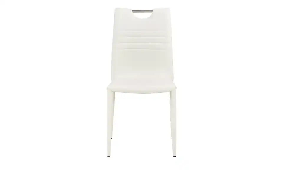Ob am Küchen- oder Esstisch im Speisezimmer, auf dem Stuhl Michelle sitzen Sie bequem. Michelle ist mit einer Sitzpolsterung aus Schaumstoff ausgestattet. Der 4-Fuß Stuhl steht auf vier stabilen Beinen aus stabilem Metall. Sitzfläche und Rückenlehne sind mit robustem Kunstleder bezogen. Dieses ummantelt auch die Beine des Stuhls. So ist ein einheitlicher Look entstanden. Einziger Kontrast ist der glänzende Metallgriff am oberen Rand der Rückenlehne. Die Rückenlehne ist mittig mit vier horizontalen Linien abgesteppt, die den modernen Gesamteindruck des Stuhls unterstützen.