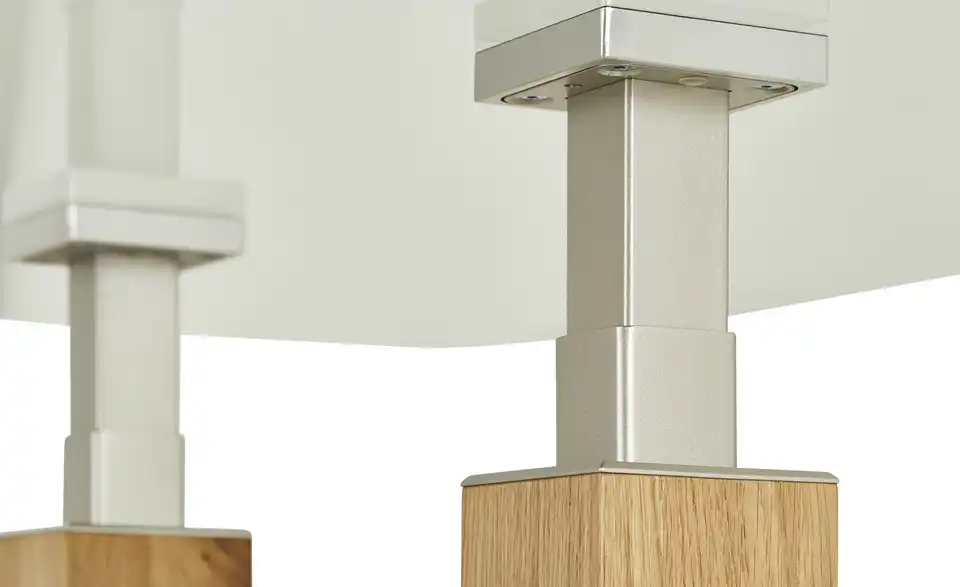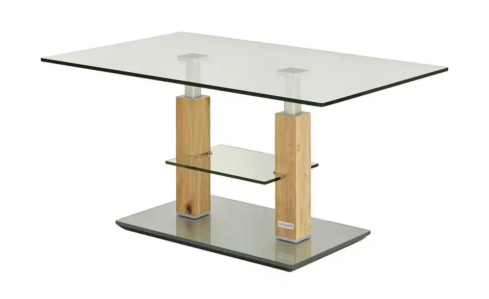 Das Highlight des Couchtisches Quatro Plus von Wohnwert ist die höhenverstellbare Tischplatte. Sie können ihre Höhe von 46 bis 65 cm variieren. Die Tischplatte ist rechteckig designt und besteht aus stabilem und pflegeleichtem Klarglas. Sie wird von zwei Gestellsäulen getragen, die mit Wildeiche furniert worden sind. Zwischen den Säulen befindet sich eine praktische Ablage, die ebenfalls aus klarem Glas gefertigt ist. Quatro Plus hat eine erstklassige Qualität und kommt mit fünf Jahren Garantie zu Ihnen.